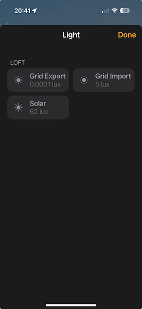 To see the energy flows(export to grid, import from grid and solar generation) click on the Light level, the level shown as lux will be the amount in Watts currently being generated, this is limited to 10000 so if you are lucky enough to have an array that can generate at this level it will max out for you.
