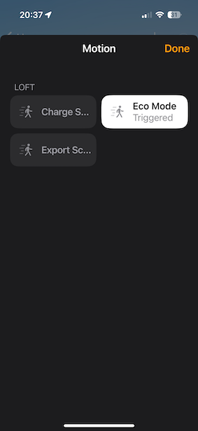 Three of the states which can be configured via the GivEnergy App or via the Web UI are represented as motion detectors, if they are triggered that represents enabled. In the example below this shows eco mode is enabled and that scheduled charge and scheduled export are currently disabled. Unfortunately a way to represent the times for these has not been found.